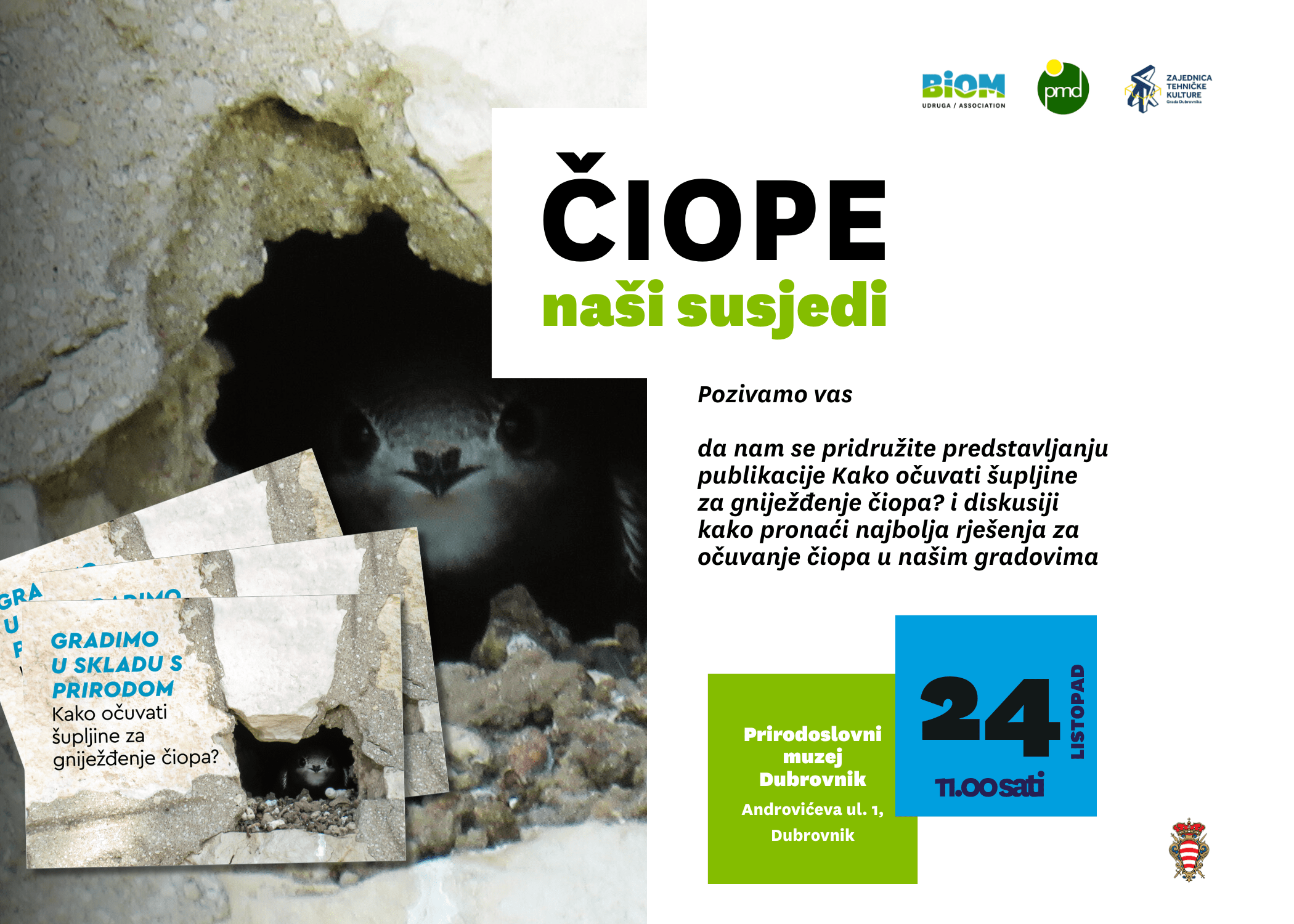 Udruga Biom, Prirodoslovni muzej Dubrovnik i Zajednica tehničke kulture Grada Dubrovnika uz podršku Grada Dubrovnika provode projekt „Čiope, naši susjedi“ čiji je cilj očuvati čiope u Dubrovniku. Prezentacija aktivnosti, ali i interaktivna rasprava o mogućnostima zajedničkog djelovanja o očuvanju čiopa, održat će se u petak 24. listopada u 11 sati u prostorijama Prirodoslovnog muzeja Dubrovnik.