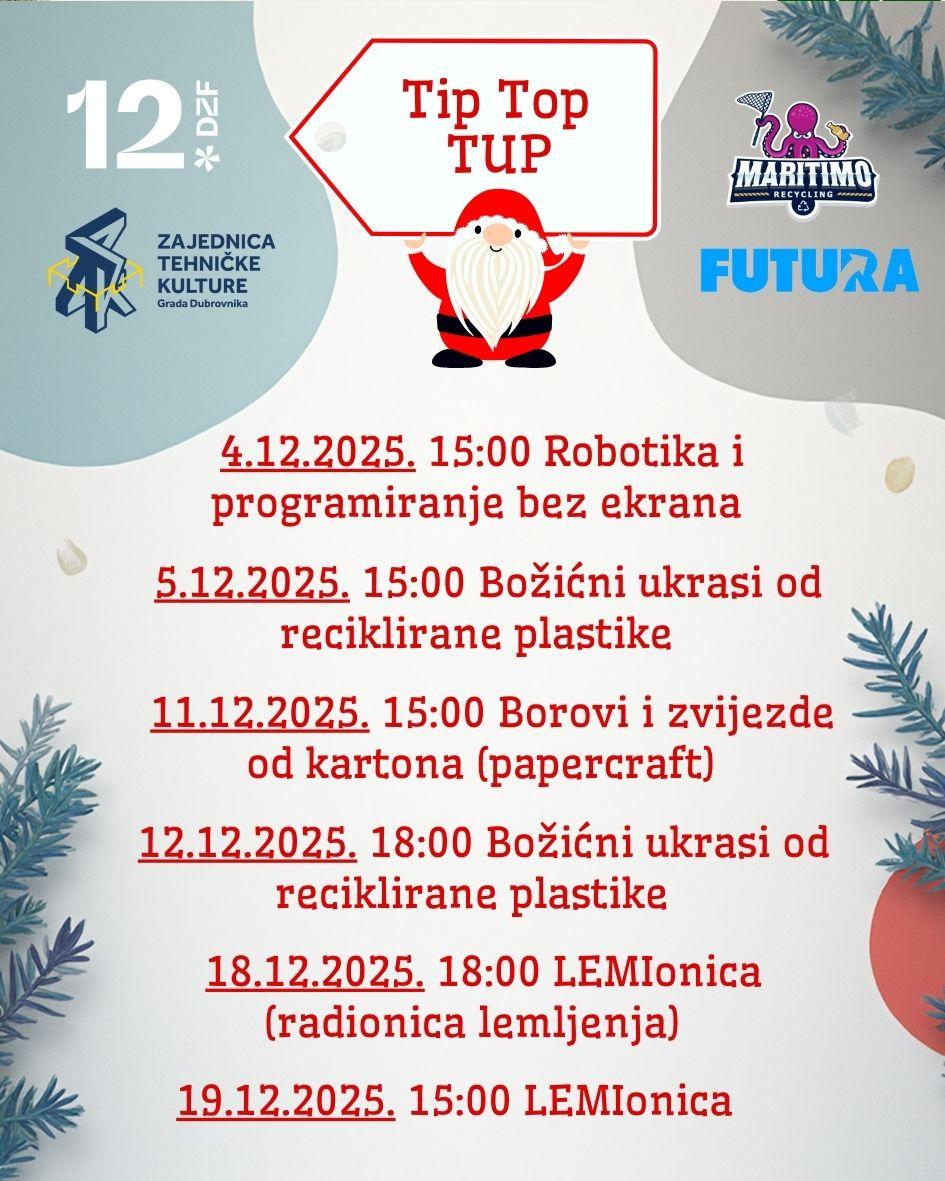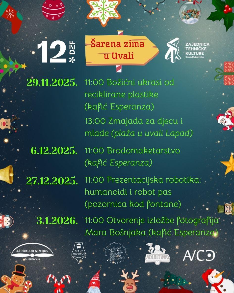 Zajednica tehničke kulture Grada Dubrovnika i njene članice (Aeroklub Nimbus, Informatički klub Futura, Društvo brodomodelara Argosy, Modelarski institut Nave Dumins, Maritimo Recycling, AVCD) sudjeluju i ove godine u bogatom programu 12. Dubrovačkog zimskog festivala. Radionice će se održati u sklopu četiri programa: Šarena zima u Uvali, U iščekivanju Božića u Mokošici (u Staroj i Novoj Mokošici), Tip Top TUP te Stanica Sjeverni Pol (na Pilama).