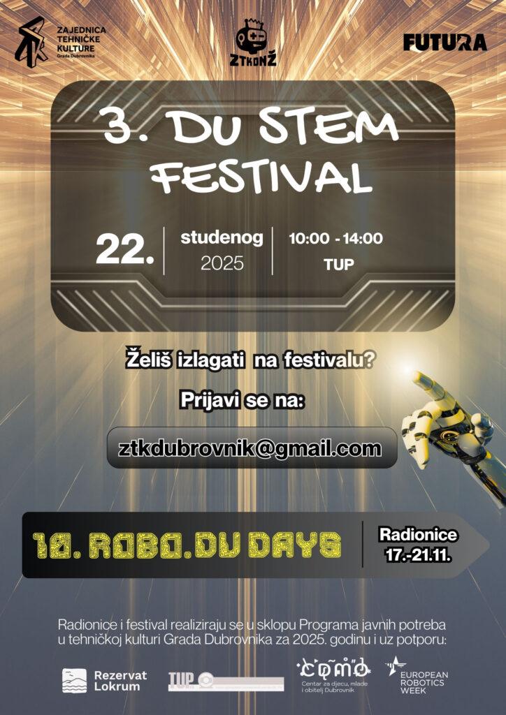 U sklopu jubilarnog izdanja Robo.Du Daysa, u subotu 22. studenoga 2025., održat će se 3. Du STEM festival u dvorištu TUP-a. Na festivalu će sudjelovati lokalne i nacionalne STEM udruge, Hrvatska zajednica tehničke kulture te Hrvatski robotički savez, a cilj je približiti STEM široj javnosti kroz radionice, prezentacije i inovativne projekte.