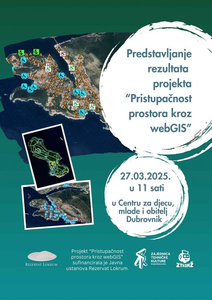 Pozivamo Vas u četvrtak 27. ožujka u 11 sati u Centar za djecu, mlade i obitelj Dubrovnik na adresi Obala pape Ivana Pavla II 44A (zgrada autobusnog kolodvora na 1. katu) na predstavljanje rezultata projekta „Pristupačnost prostora kroz webGIS“.